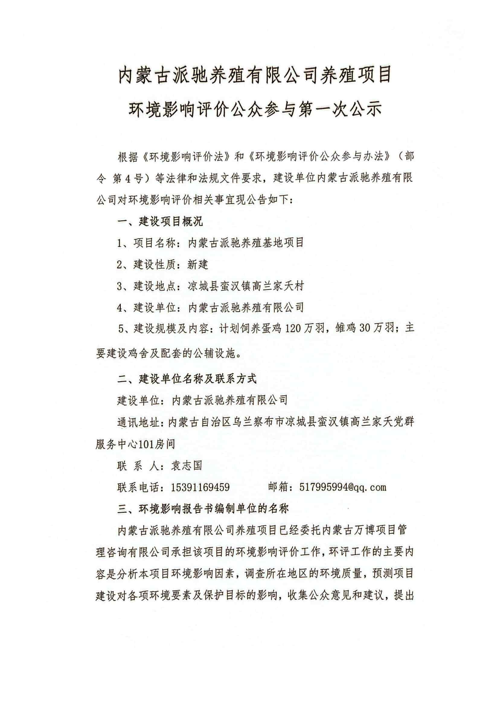 內(nèi)蒙古派馳養(yǎng)殖有限公司養(yǎng)殖項(xiàng)目環(huán)境影響評(píng)價(jià)公眾參與第一次公示